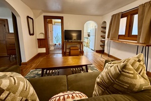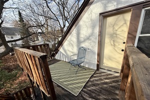 The true star of the Lofted Lounge is the sunny, south-facing private deck, surrounded by trees and perched above it all. It’s the perfect spot for morning coffee, afternoon lounging, or winding down under the glow of solar lights in the evening. Inside, a dedicated workspace makes it easy to mix work and play, while a Smart Roku TV lets you kick back and stream your favorite shows.